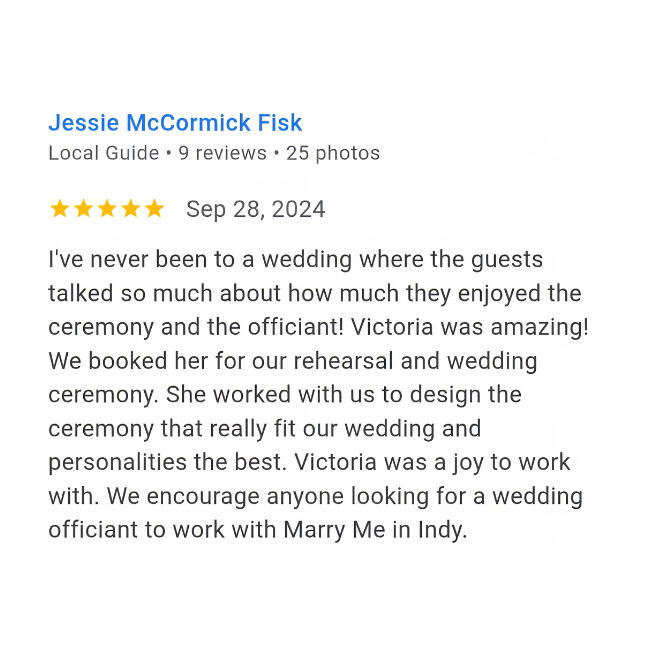 We are professional wedding officiants, Victoria and Peter Meyer.Victoria started Marry Me In Indy! LLC 15 years ago. Peter joined her in 2022.Peter performs civil ceremonies in our office.Victoria answers phones, emails, and will travel to your location to marry you!
